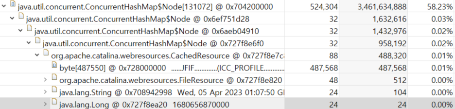 HashMap 구조로 되어 있는 org.apache.catlina.webresources.CachedResource에서 메모리를 대부분 점유하고 있는게 아니겠어요?