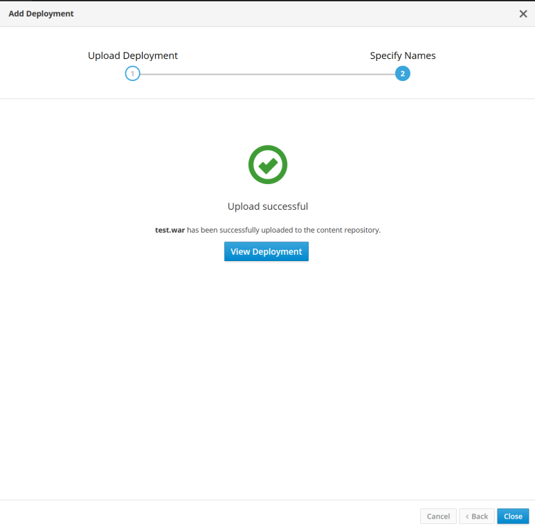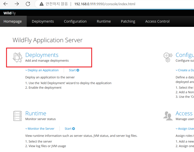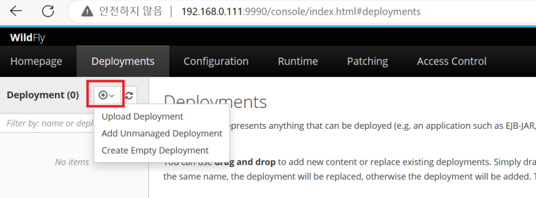 Wildfly 에서 Application 을 적용하기 위한 가장 간단한 방법은 웹브라우저의 관리자 기능을 통헤 Deployments 를 적용하는 것입니다.