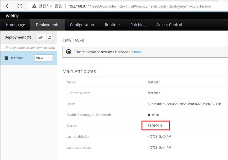 Disable 을 선택하면 위와 같이 Status 가 STOPPED 로 변경됩니다.